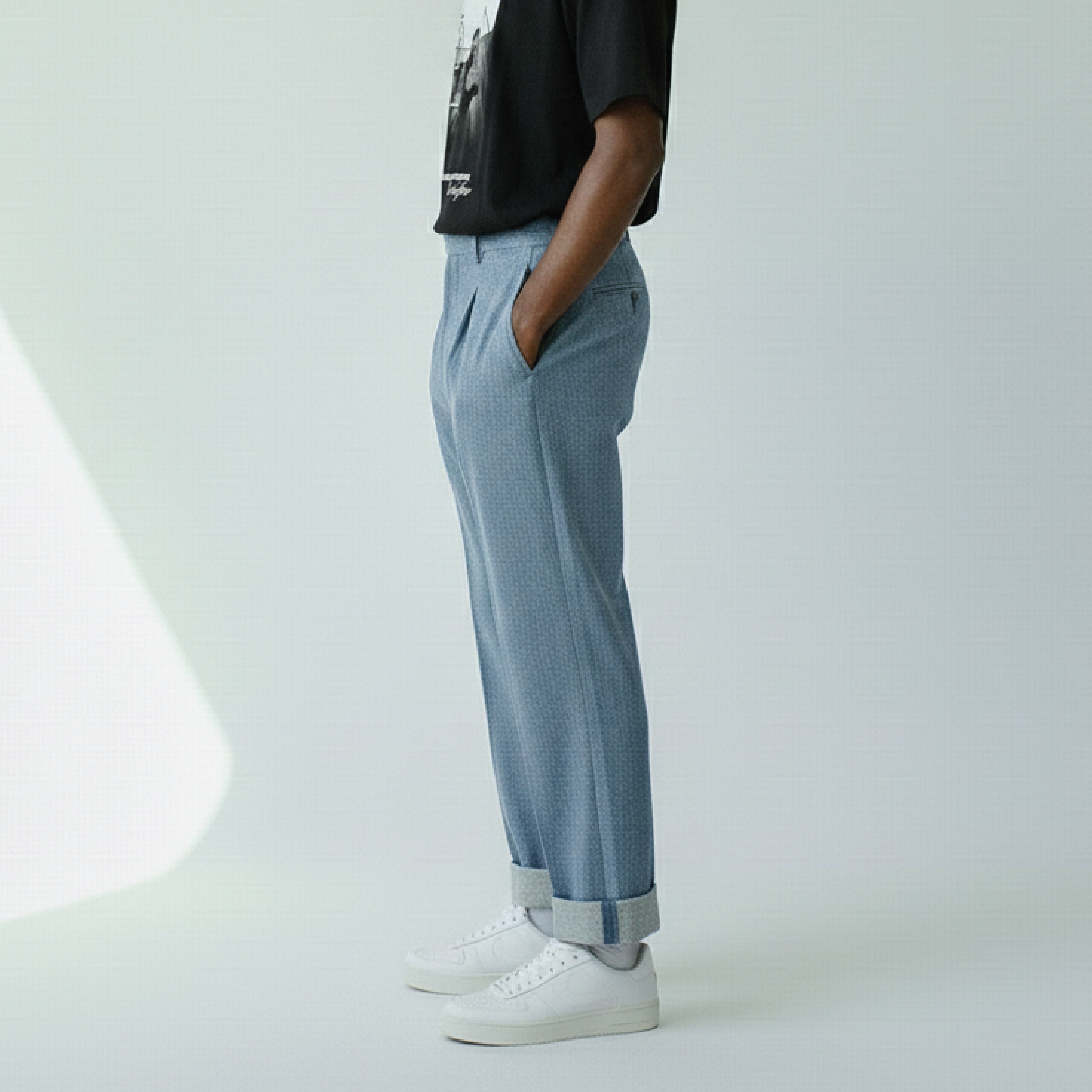 タックと膝下から裾のシルエットを目立たせる適度なボリューム感で